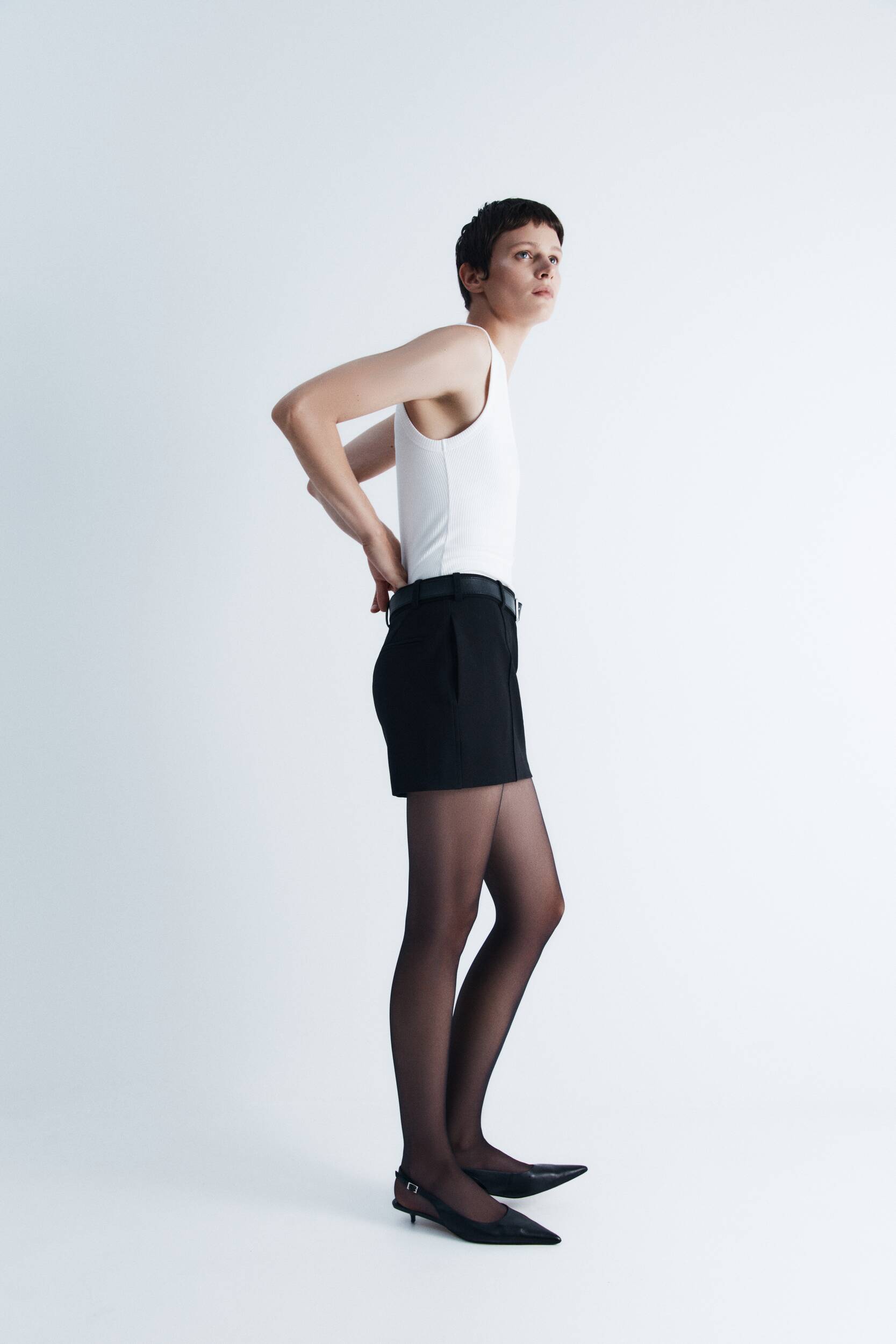 Мини снова в моде. Предлагаем собрать образ в эстетике ковровых дорожек 90-х. Мини-юбку с заниженной талией – черную или в цвете «капучино» – сочетаем с топом в лапшу, а в качестве акцента подчеркнем юбку с помощью кожаного ремня.